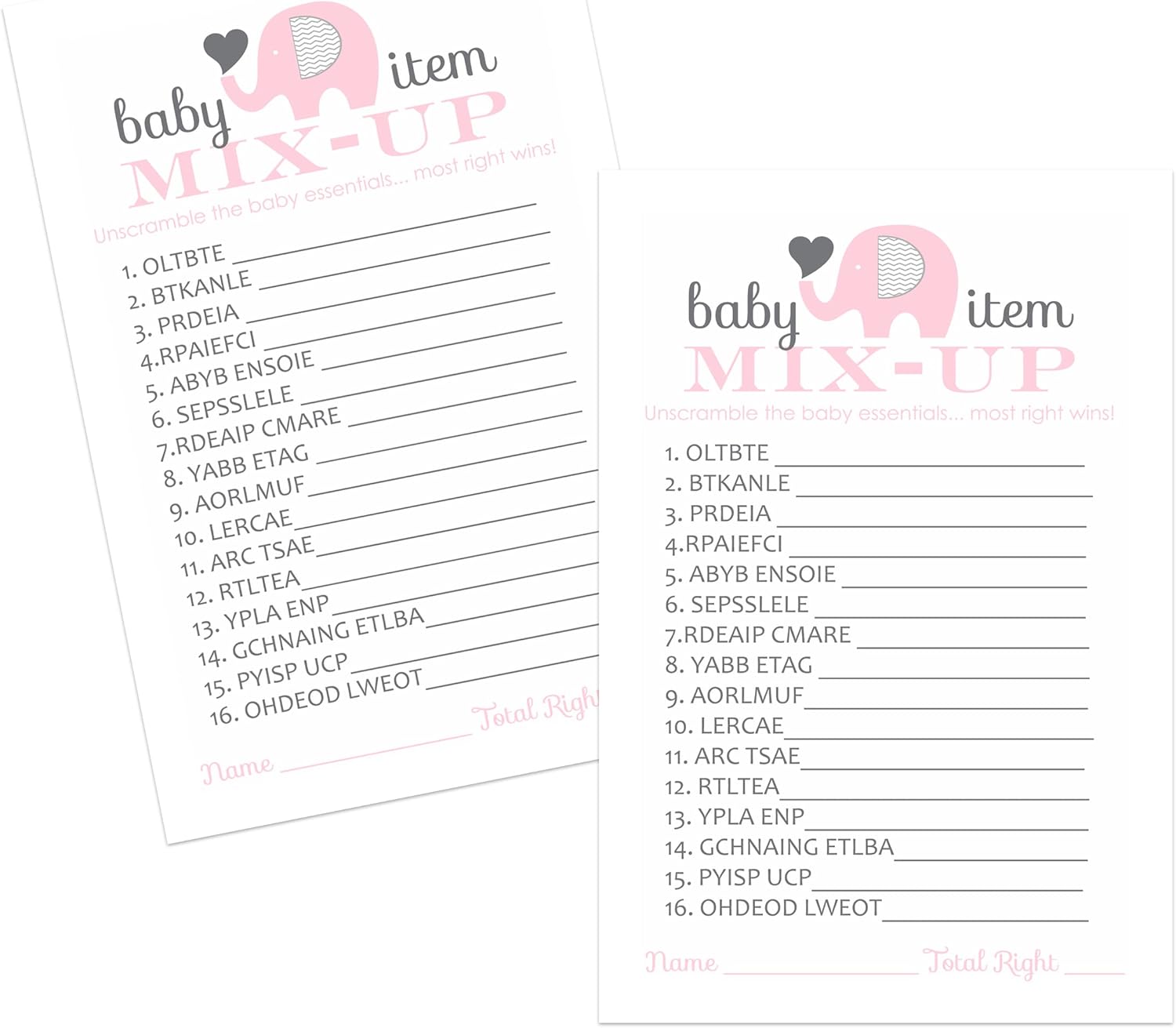 Pink Elephant Baby Shower Word Scramble Game Card 25 Pack Unscramble Babble Jumble Mix Up Girls Little Peanut Theme Ideas Sprinkle Activities Amazon Ca Toys Games